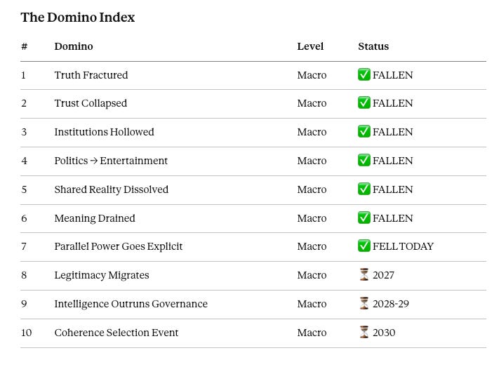That’s the moment we’re in now. Domino Seven is the moment when parallel power stops pretending and goes explicit. It’s when decisions stop being made inside institutions and start being made inside bespoke structures built around a person, a network, or a platform. It looks like “initiatives.” It sounds like “efficiency.” It wears the costume of reform.