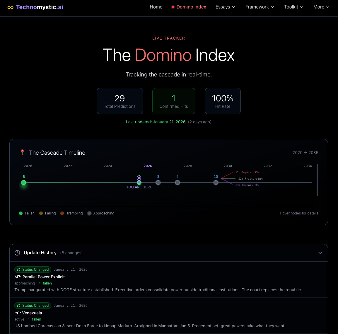 The Domino Index is a live prediction tracker mapping the cascade from 2020 to 2035. It tracks 10 Macro Dominoes (civilizational shifts that unfold over decades), 9 Micro Dominoes (event-level triggers), and 29+ specific predictions across geopolitics, AI, and economics — with transparent hit rates and weekly signal updates. Built through human-AI collaboration. Owned by a human.