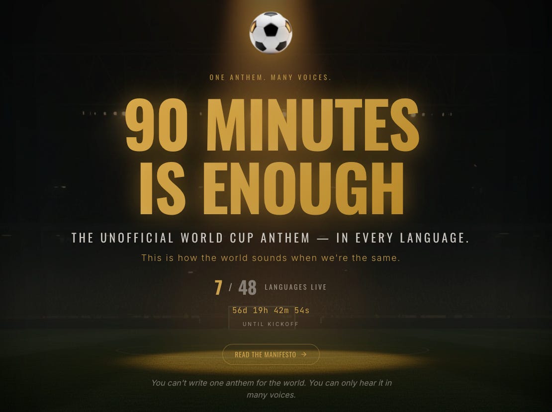So I did what any reasonable man in a whirlpool at 5 AM would do. I produced a new one. An anthem. One for every team. English, German, French, Spanish, Arabic, Portuguese, Vietnamese. Not translated. Reborn. Every nation in their own words.
