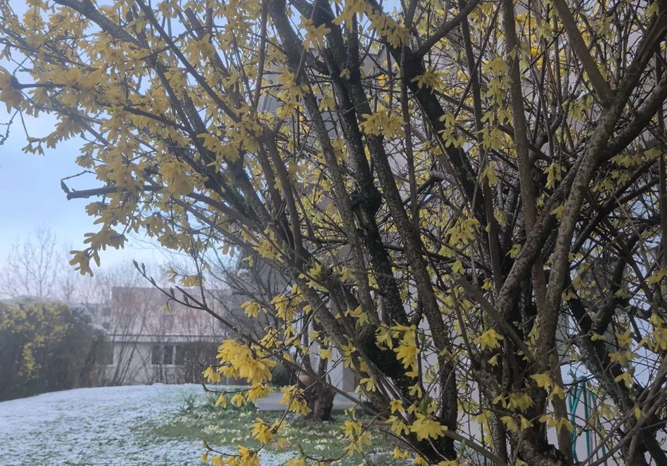 It’s right there, two metres from the whirlpool, and it’s exploding. Bright yellow on bare brown branches. No leaves. No green. No preparation. Just fire on dead wood in the cold.