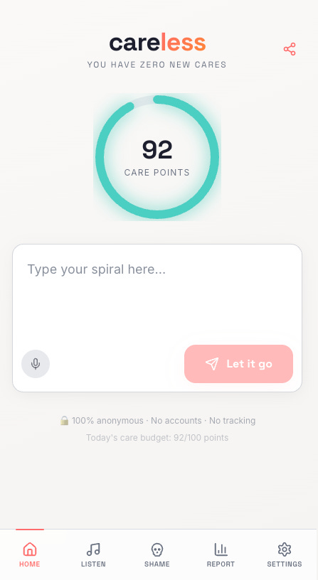 You start every day with 100 Care Points. Every worry costs you. When you hit zero, the app congratulates you: “You have officially run out of cares to give today.”